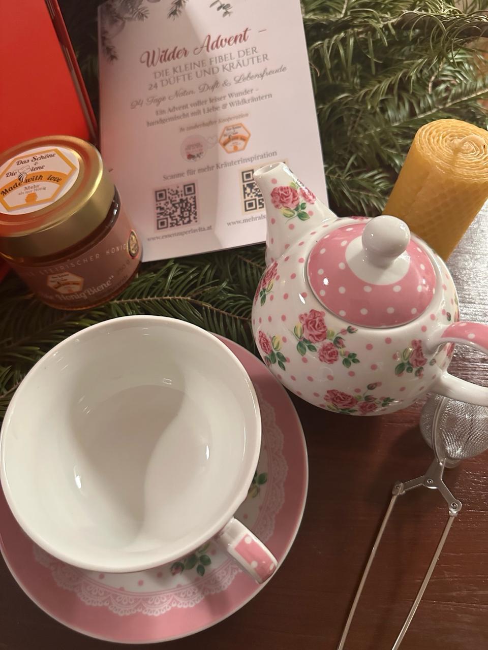 Ein Glas, das nach heimischen Wildkräutern duftet, kombiniert mit Früchten, Blüten und Gewürzen – naturrein, handgemischt und ohne künstliche Aromen. Ein tägliches Ritual voller Ruhe, Wärme und duftender Adventsmagie.